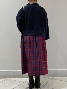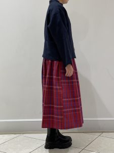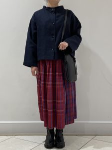 お次はボタンを閉めてスカートと合わせたガーリーコーデです。