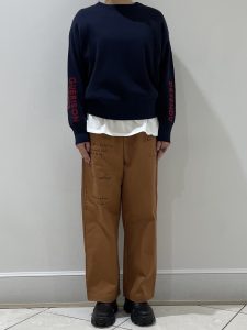 先ほど紹介したニットにTシャツを重ねてロゴパンツを合わせたカジュアルコーデです。