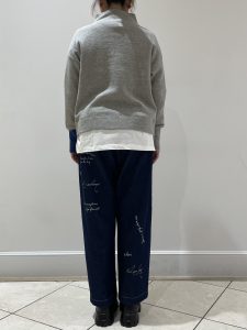 お次はニットの中にロンTを重ねてデニムを合わせたカジュアルコーデです。