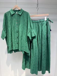 フラワージャガード生地で、キュロットとドロップして膨らんだ5分袖カフスのブラウスもございます。
