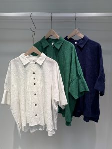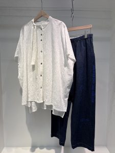 リネン混の繊細な表情が可愛いフラワージャガードの生地のシャツは