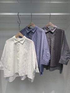 前後どちらでも着用可能なノーカラーブラウス