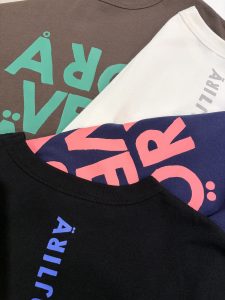 ロゴを並べたカラフルなアートTシャツは、「時間を越えた先にある、癒しの場所」の比喩の造語