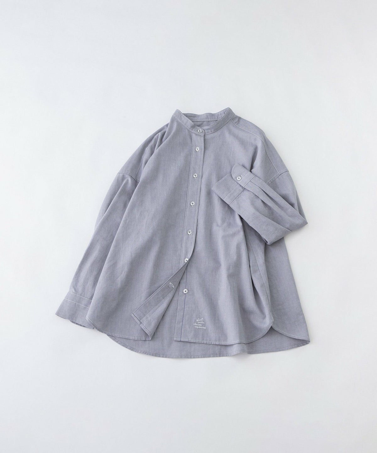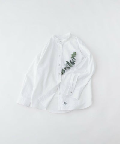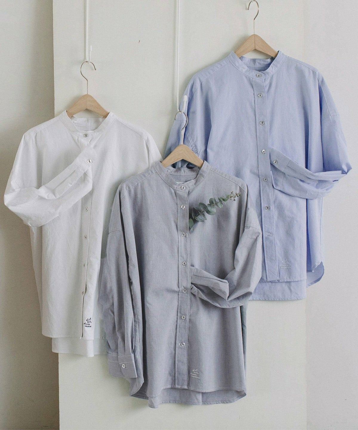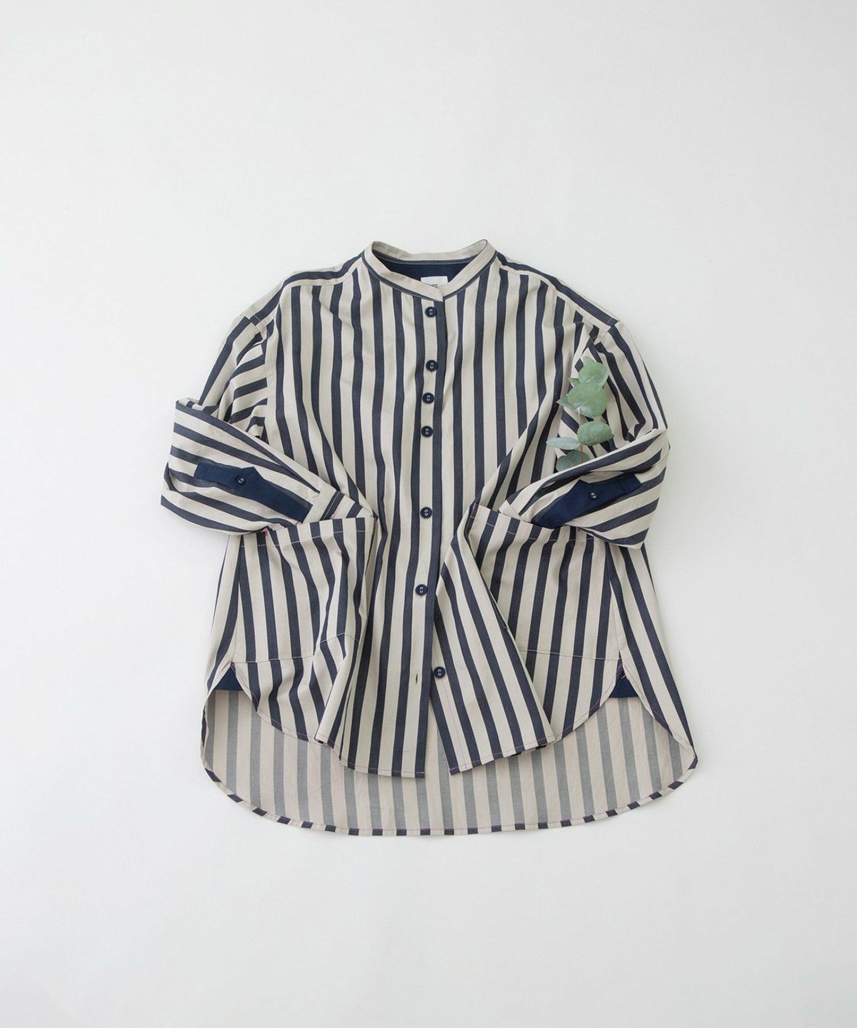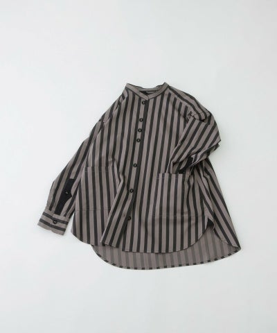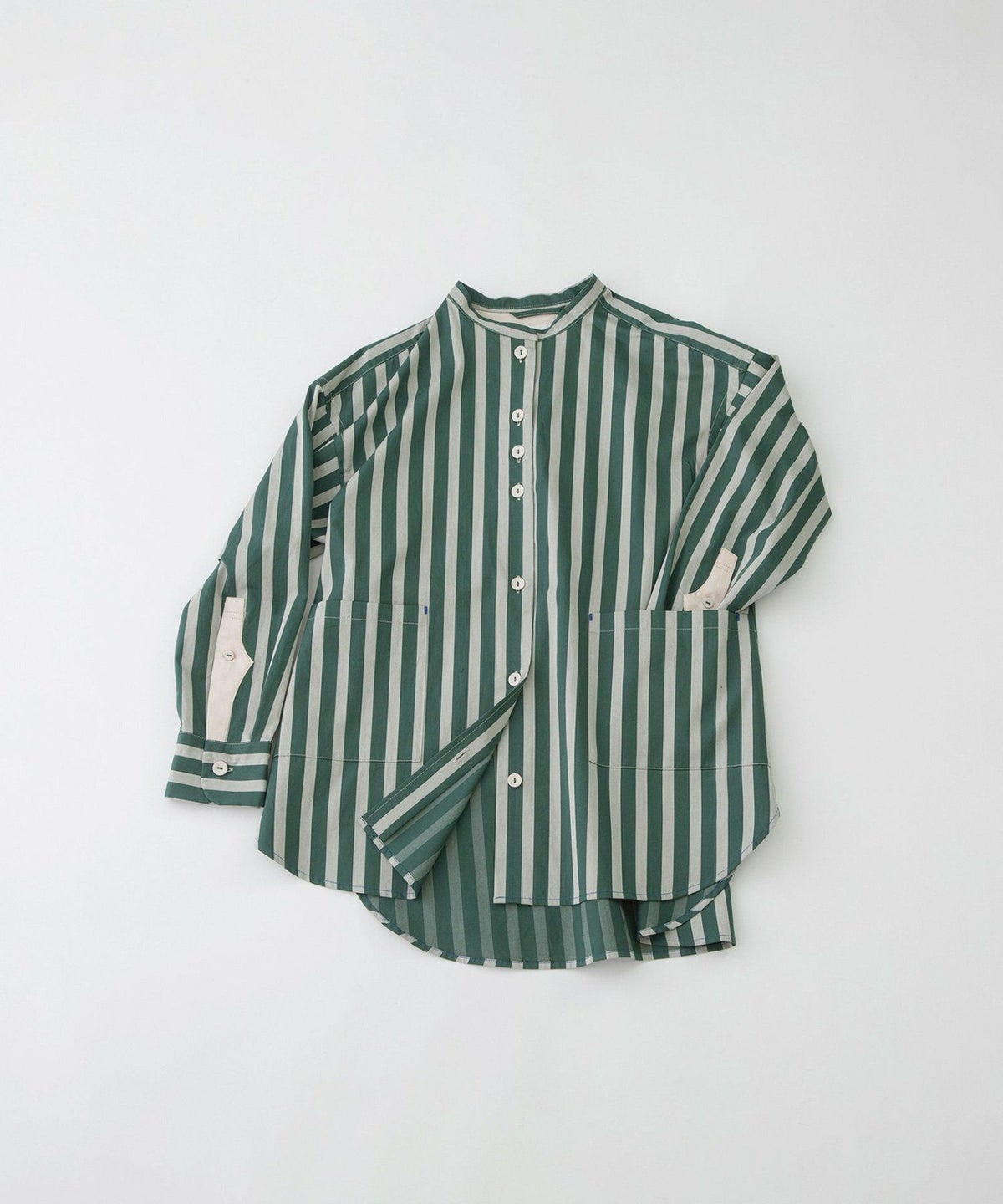 【WINTER SALE】コットンサテンストライプバンドカラーポケットシャツ