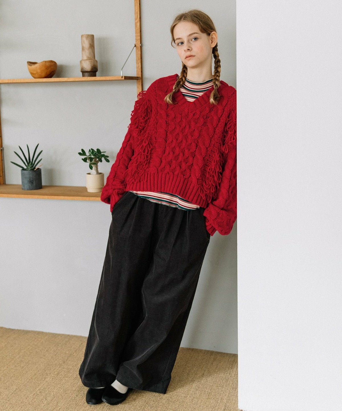 SALE 再値下げ 2BUY 10%OFF 【MORE PRICE DOWN】ループフリンジVネックケーブルニット ¥ 7,150 ¥ 5,390 税込 販売期間 2026/02/11 0:00 〜 2026/02/24 10:00 カートに入れる