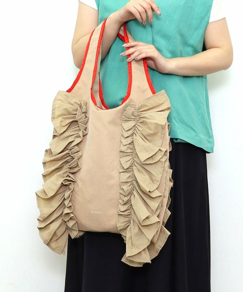 口元テープ色との配色、ランダムなボリュームフリルがポイントのバッグ。