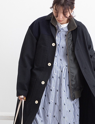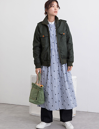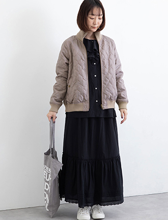 ワンピースやスカートアイテムとの合わせが好バランス。あえてレーシーなブラウス、スカートでテイストミックスを楽しむのがおすすめです。ミニマムなサイズ感を生かして、インナーダウンなどの代わりにアウターの重ね着も◎何通りにも楽しめるのが魅力的なブルゾンです。