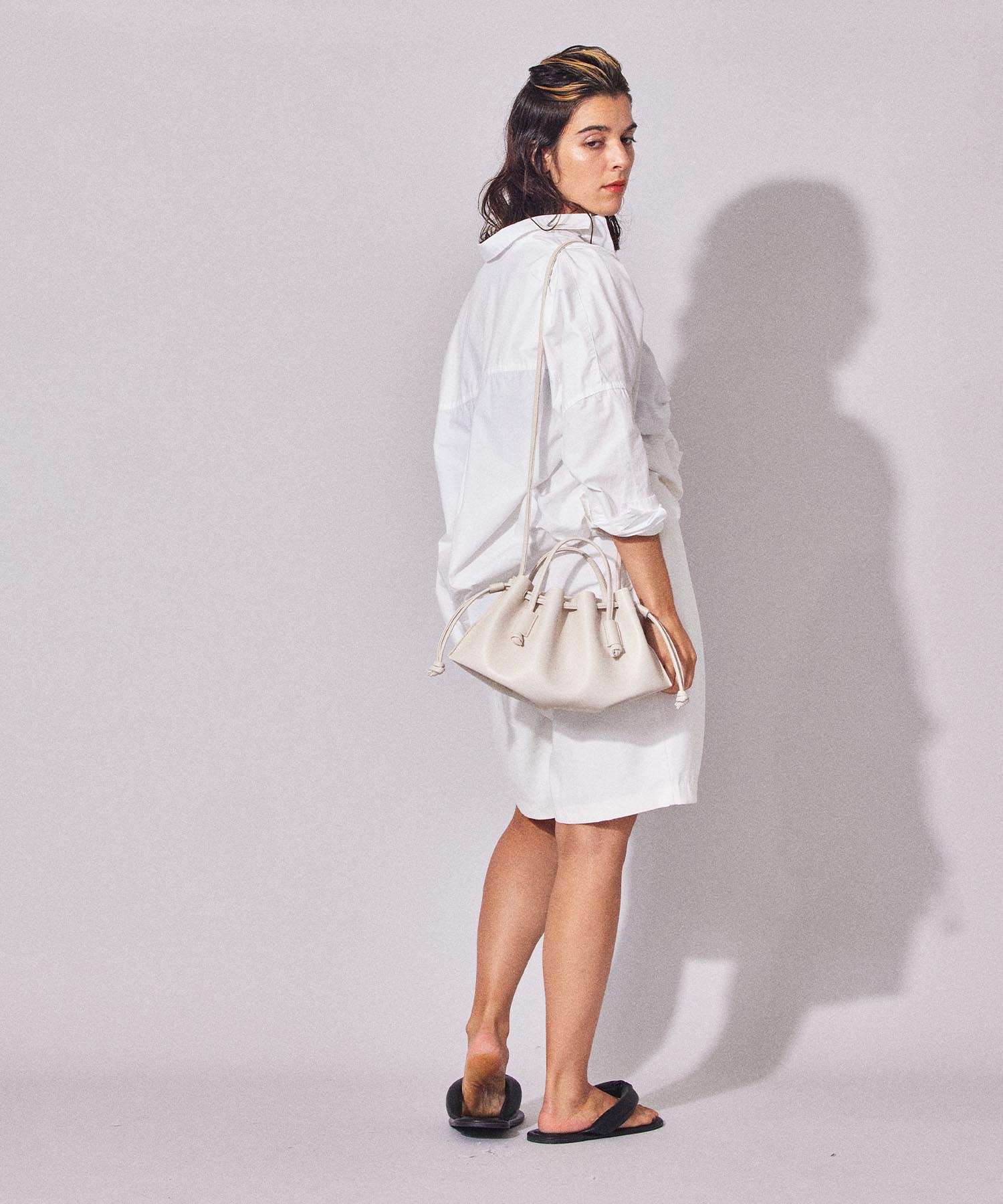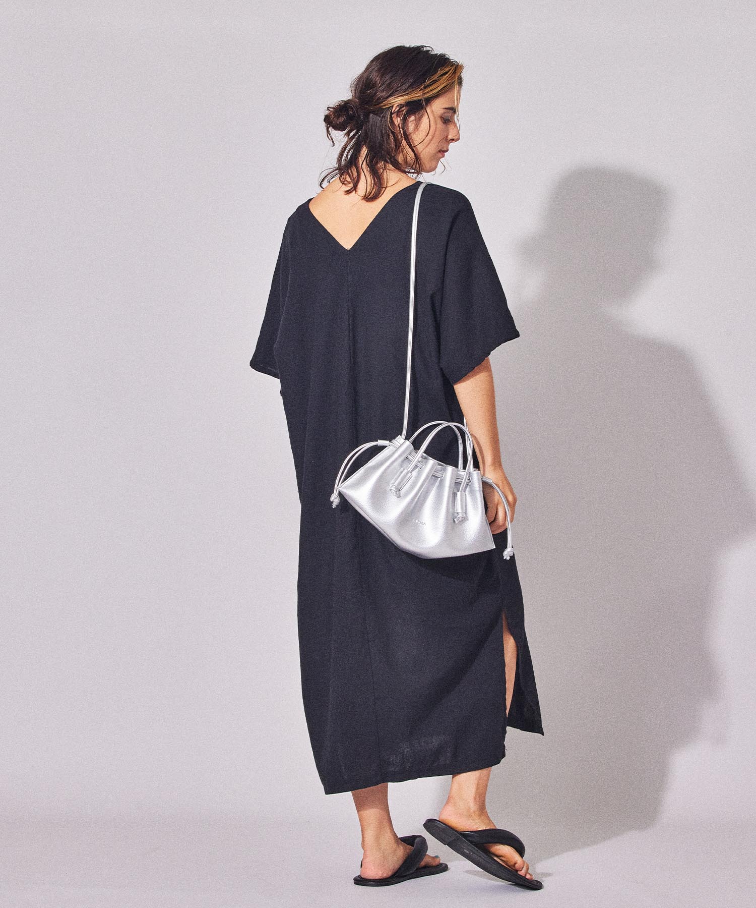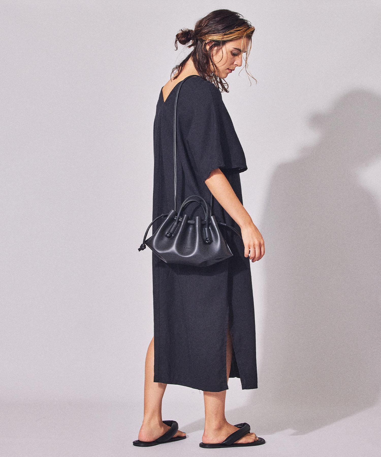 しなやかなフェイクレザーを採用した軽い仕上がりの2wayバッグ。フラットなボディのマチを広げると立体的になるLAUGOA定番ディティールがシャーリングを纏ったデザインで登場。やわらかく奥行きのある表情が今のムードにマッチし、爽やかなカラーラインナップはコーディネートの洗練度を上げてくれる。