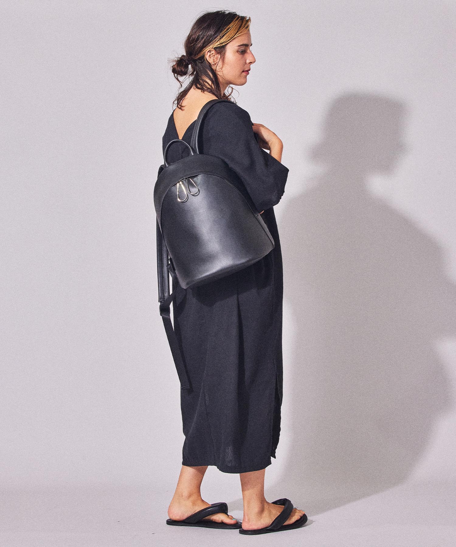 曲線が美しいシームレスなボディとクリーンなワントーンがカジュアルになりすぎず、大人な空気感のバックパック。開口部は両開きのファスナーで物の出し入れがしやすく、背面のファスナーも備えた利便性が使いやすさを後押ししてくれる。ベーシックな佇まいでユニセックスに楽しめるデザインも魅力。