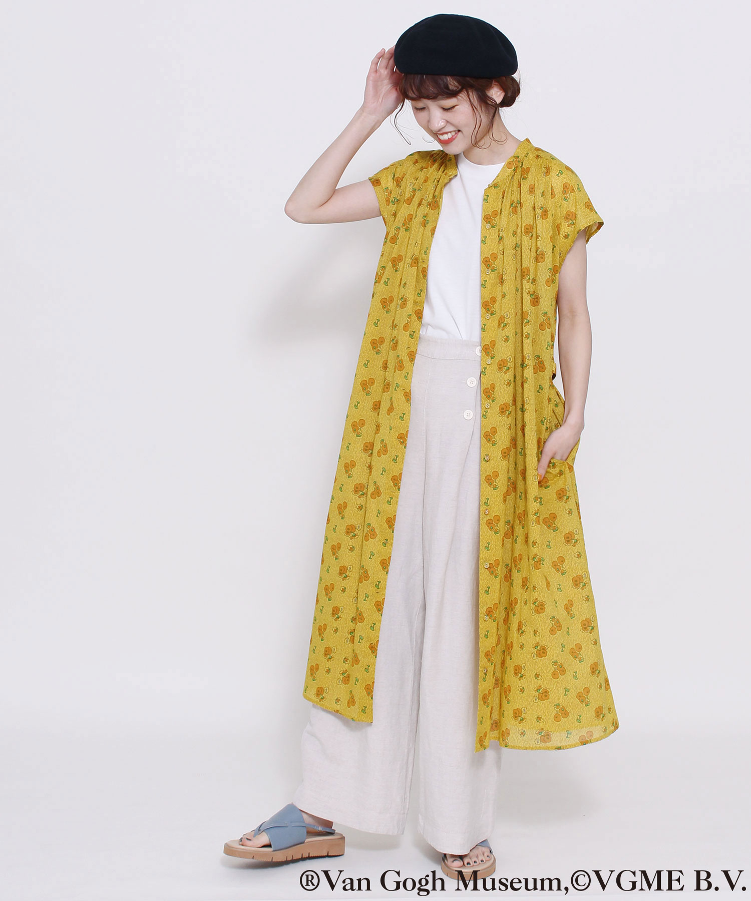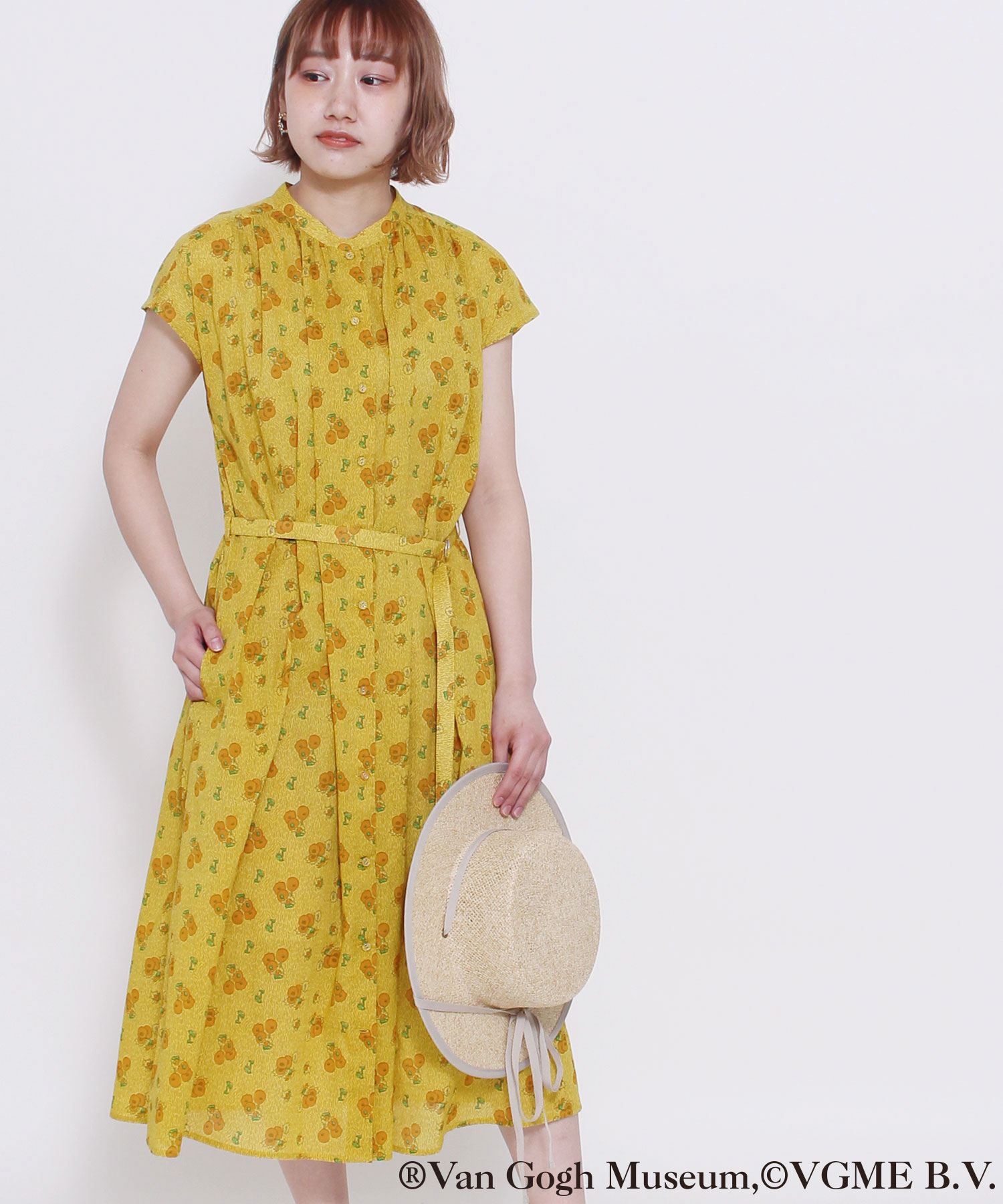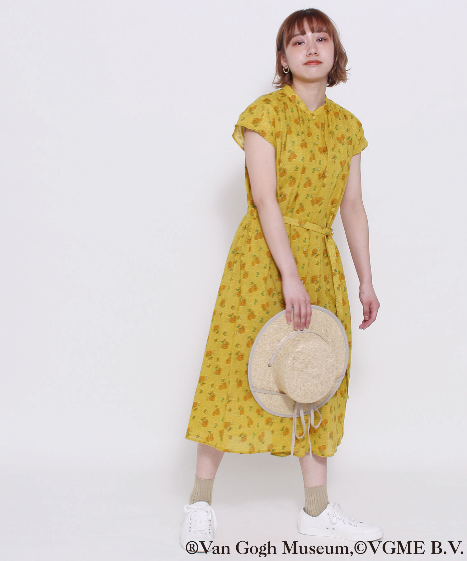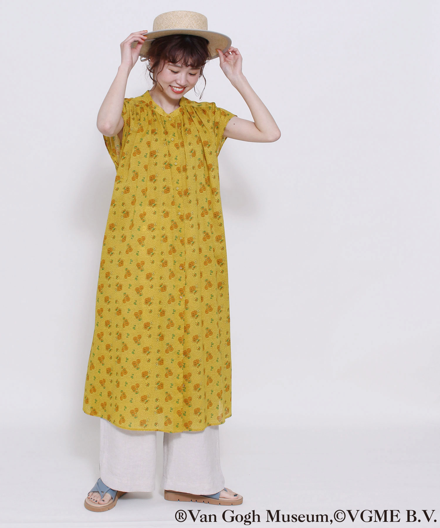 「Sunflowers」から描き起こされた総柄のプリントを軽いコットンローンにプリントしたシリーズ。夏の日差しに映えるひまわりの色味が特別感のあるワンピースです。