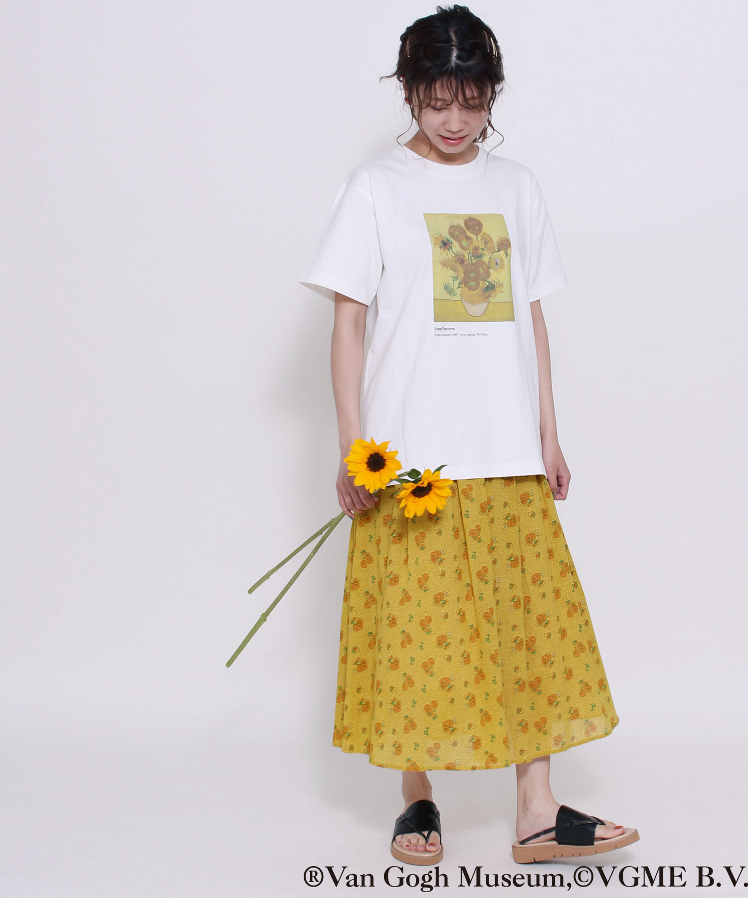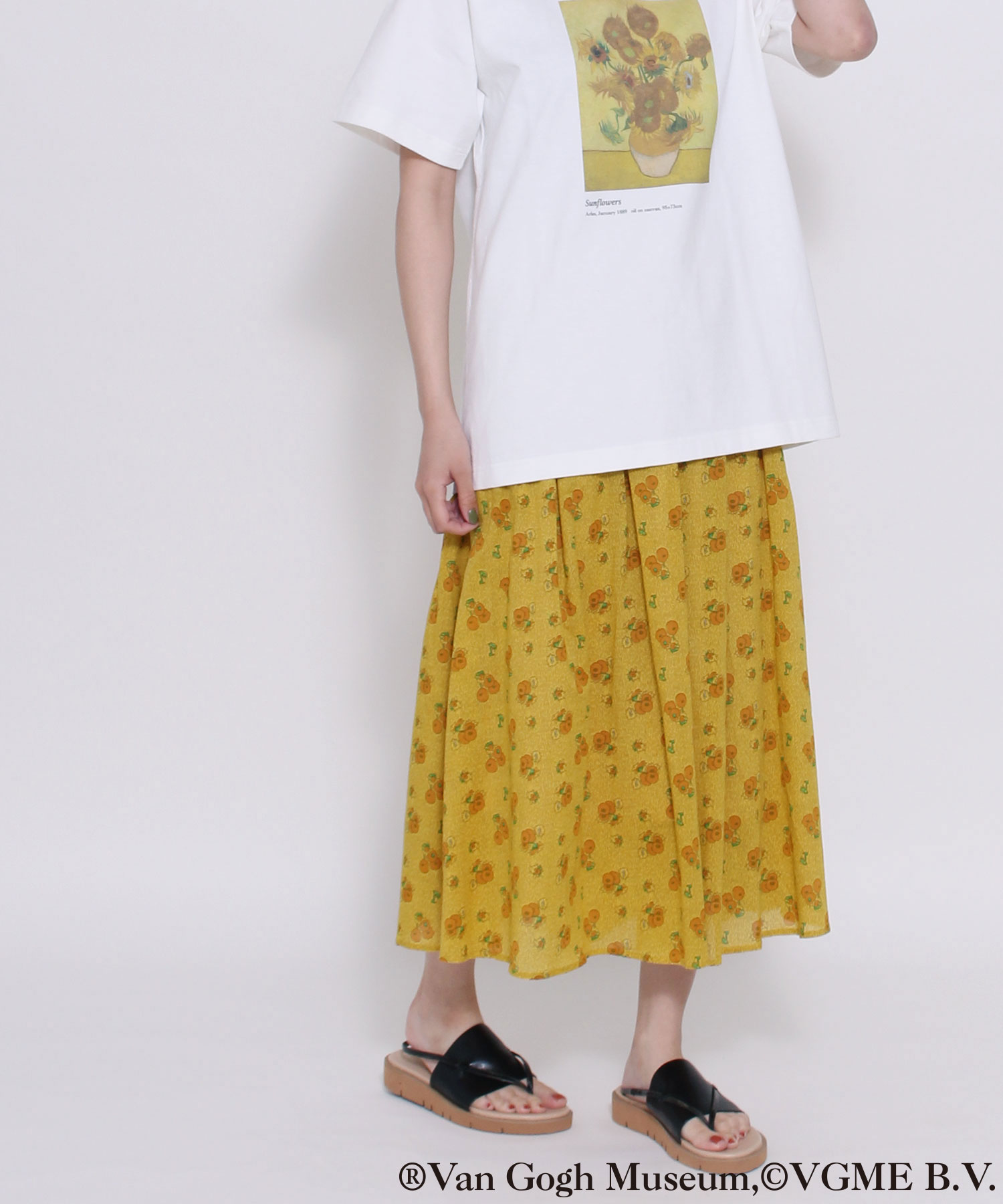 「Sunflowers」から描き起こされた総柄のプリントを軽いコットンローンにプリントしたシリーズ。夏の日差しに映えるひまわりの色味が特別感のあるスカート。ブラウスとのセットアップスタイルもおすすめです。